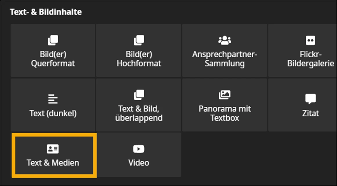Das bisherige Content Element "Text & Bild" wurde in --> "Text & Medien" umgewandelt, so dass nun statt eines Bilds auch ein Video neben einem Text platziert werden kann.